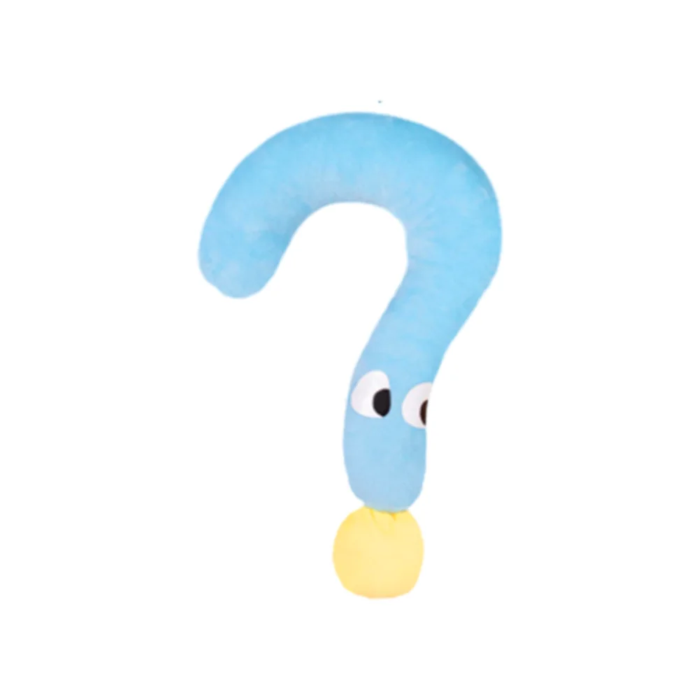 Cojín de peluche para mascotas con diseño de ojos grandes y signo de interrogación. 49 cm. Color azul. Pack x 6 unidades